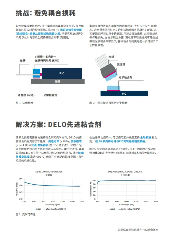 光子集成电路耦合面临光纤对准精度高、热应力变形、光学损耗等挑战。DELO DUALBOND系列粘合剂针对边缘耦合与微透镜耦合场景,提供透光率>98%、收缩率<1%及低CTE特性,经260°C三次回流焊后光学性能稳定。产品已通过iNEMI等机构验证,粘合剂相关信号损耗低至0.2dB,支持UV预固快速校准,兼顾高可靠性封装与产线效率。