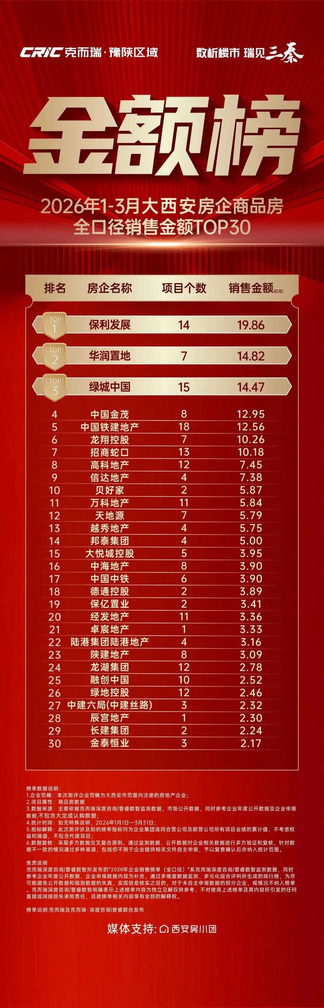 全口径销售金额:1-3月7家房企销售价金额超10亿元。保利发展以19.86亿元业绩卫冕冠军,凭借稳健策略、产品品质与精准布局持续领跑。