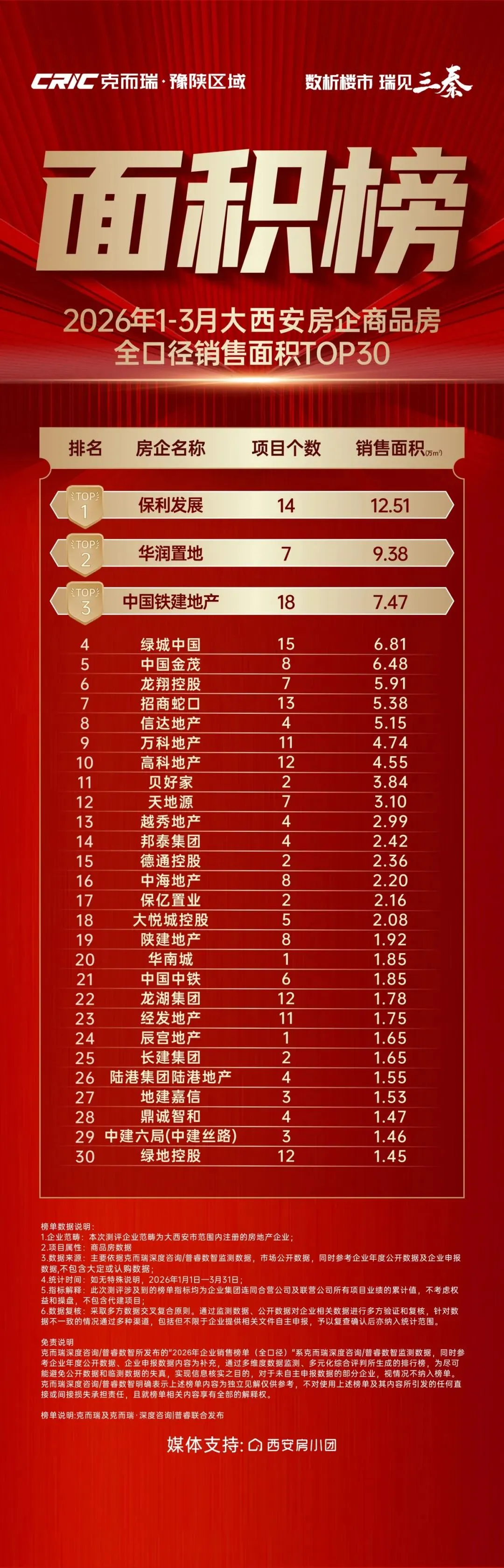 1-3月大西安房企全口径销售 TOP30整体修复,TOP10房企占TOP30 总规模约60%,市场集中度保持高位,第一梯队以国央企为主,占比达70%,保利发展、中国铁建、华润置地等凭借稳健经营与多盘联动,持续贡献稳定业绩。
