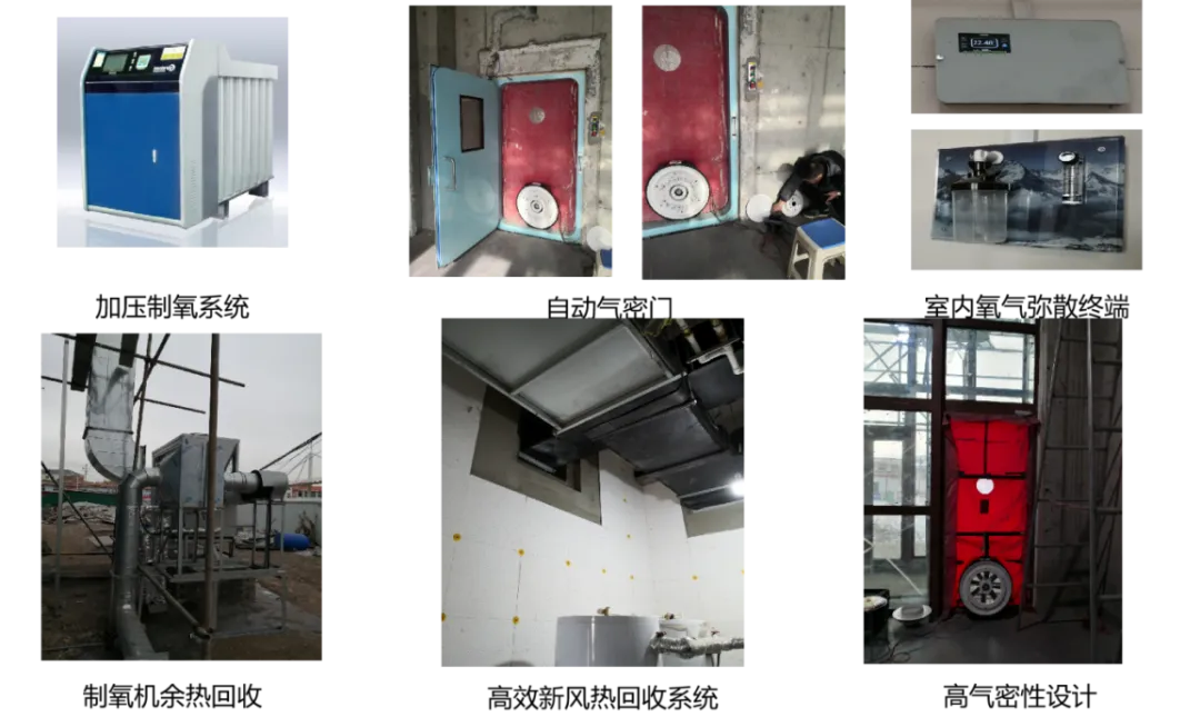 本项目是国际首例增压、增氧近零能耗建筑,为减少低氧气浓度对居民身体健康产生的不利影响,该项目可通过提升室内氧气浓度,人工制造富氧环境,用于改善使用者的身体健康状态。通过设置增压增氧设备,实现室内、外压差可实现0-+200pa可调,同时室内氧气浓度与海拔2700米相当。