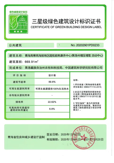 本项目为“十三五”国家重点研发专项“新型建筑智能化系统平台技术”示范工程、“十三五”国家重点研发专项“近零能耗建筑技术体系及关键技术开发”示范项目、“十三五”国家重点研发专项“藏区、西北及高原地区利用可再生能源采暖空调新技术”示范工程、青海省科技厅科研项目“高寒高海拔地区被动式超低能耗建筑清洁供暖集成技术体系研究与示范”。2021年,被认定为青海省科研科普基地,果洛藏族自治州科技局建设的省政府常务会议拟定为“民生十件实事着力改善人居环境”专项建设工程。本项目关键技术指标达到严寒地区同类建筑的国际领先水平,高寒、高海拔、富氧、增压的近零能耗建筑未见国际同类型经验。