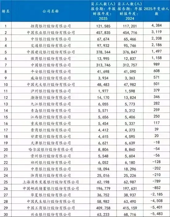 根据这30家银行财报公布的员工数量,并结合2024年财报的数据,我们可以推算出各大银行2025年的员工变化情况。