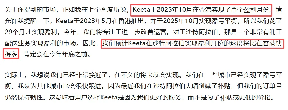 新业务中,海外Keeta之处了良好的增长势头,香港单位经济效益转正。