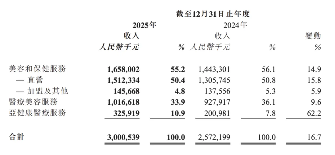 截至2025年12月31日,美容和保健业务的收入同比提升14.9%,达到16.6亿元;在集团的收入占比从56.1%下降至55.2%。