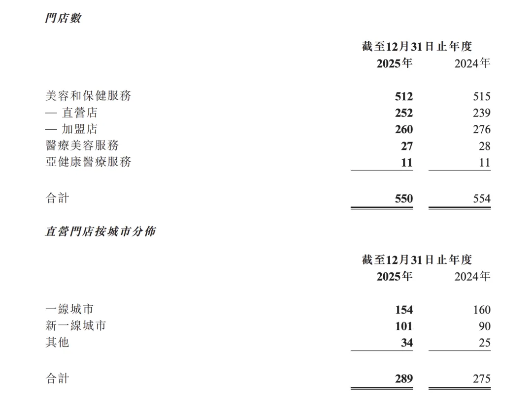 截至2025年12月31日,美丽田园集团的门店总数为550家,较2024年同期减少4家,其中直营店289家,加盟及托管店261家。
