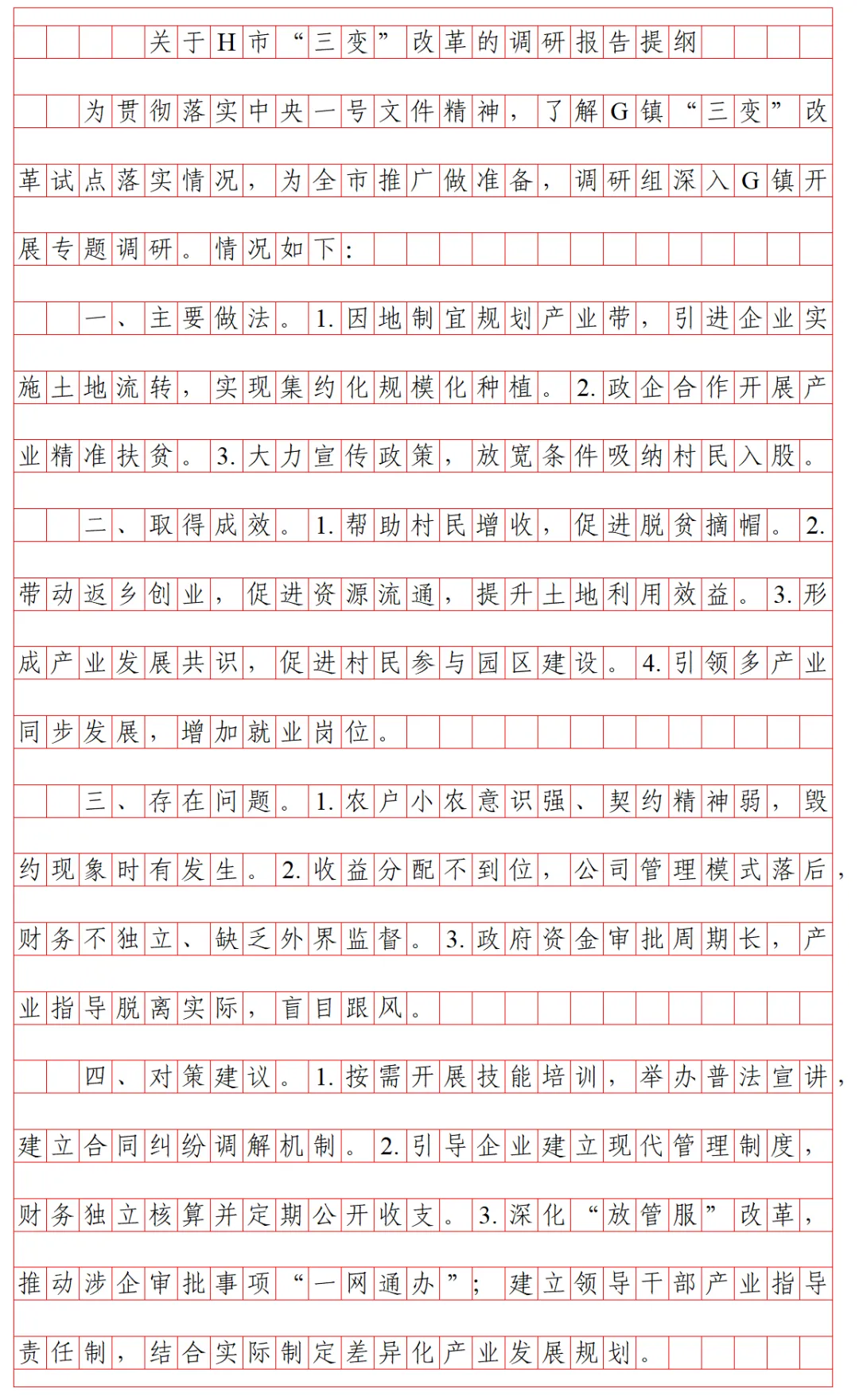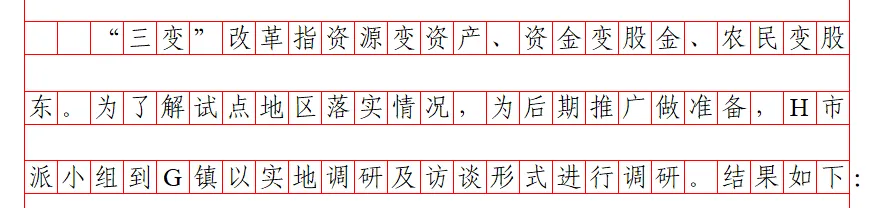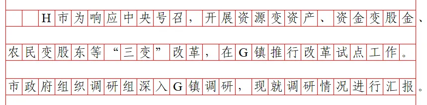 和参考答案相比,我漏掉了2个点,其一开展这次调研的目的是“为后期大范围的推广做准备”,其二是调研形式。不过我觉得参考答案中的“H市”可以具体为“市政府”,号召最好也加上。想着综合两个,但是怎么着都缩不到3行: