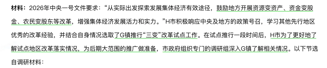 参考答案是把做法和成效分开写的,但我原本没考虑到这点,就还是想维持原来的想法,把做法和成效写在一起,但是没想到写出来特别混乱,变成了简单地罗列,AI说我这是流水账式的“混乱穿插”,想到一句来一句。为什么会这样,比如以增加农民收入这一条:不管是土地流转,还是收益分配,甚至就业,都是增加农民收入的方式,我就不知道把这条往哪写了,单独写在答案中间,又显得没有逻辑。我想着在原答案的基础上进行修改,还是采用做法+成效的方式,修改之后: