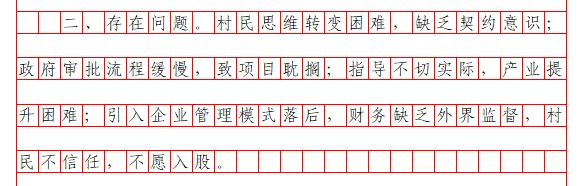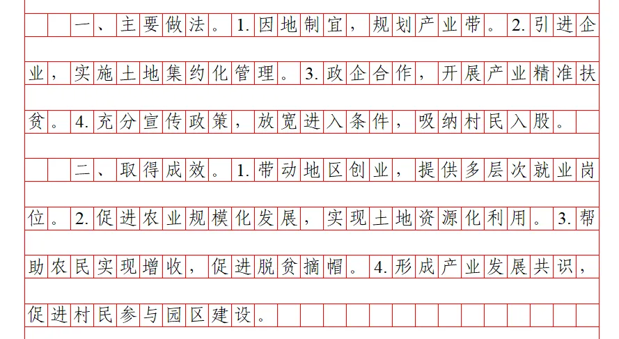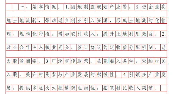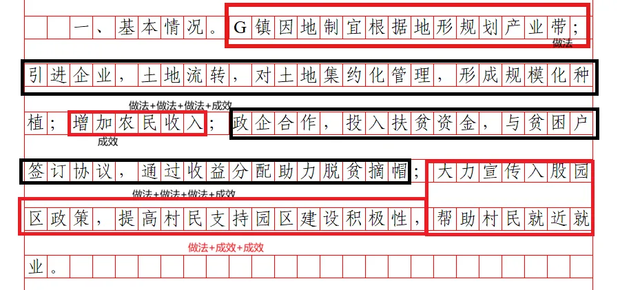 所以最后形成的答案,其实不是上面这样,哈哈哈哈!!!因为字数还是超了,所以又浓缩了一下:值得提醒的一点:做法和成效还是分开,不然部分成效属于多个做法的综合(比如收入增加,来源土地流转资金、入股分红、就业),做法和成效在一起,确实很容易使得逻辑混乱。字数控制太难了,这对我来说是个难点,因为控制字数其实就是分配各个要点的字数,是提取要点的能力,也是准确描述要点的能力。