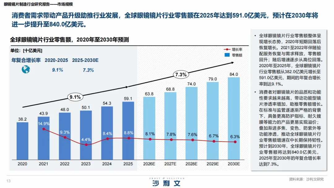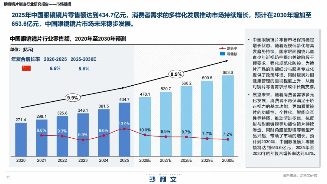 2026年沙利文眼镜镜片制造行业研究报告显示,镜片材料历经天然水晶、光学玻璃、PC镜片迭代,光学树脂镜片凭借轻量、安全、易加工等优势占比超70%,成为市场主流,未来将向高折射率、多功能及生物基可降解方向发展。中国镜片产业链上游国外企业主导高折射率树脂单体,国内企业加速追赶;中游涵盖凯米、明月等制造商与蔡司、依视路等品牌商;下游依托眼镜店、医院、电商等渠道。2025年中国镜片出厂销售额230.0亿元,零售额434.7亿元,预计2030年分别达337.9亿元、653.6亿元。行业竞争向技术升级转型,功能性镜片占比近半,微结构镜片为青少年近视防控主流,医疗渠道集中度高,外资品牌占优,本土企业逐步突破,未来将向动态离焦、预防前移、组合治疗、数智化管理方向升级。