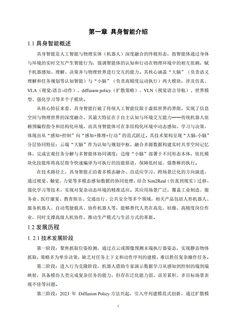 本白皮书由中科深谷2026年3月发布,系统阐述具身智能、专业建设及实验室建设核心内容。具身智能是AI与机器人深度融合形态,涵盖大脑与小脑模块,历经多技术与产业发展阶段,应用于人形机器人、非人形产品、科学智能等领域,是国家战略、产业升级、社会需求与技术发展的必然方向。具身智能专业为交叉新兴学科,培养跨领域复合型人才,就业前景广阔,课程分基础、核心、高端层,按主导方向动态建设。具身智能教学科研实验室设综合创新实践中心,包含具身运动控制、全局感知与复杂控制、具身高级控制与应用、具身智能应用系统四大中心,配备各类机器人、感知、控制、算力等设备,支撑教学、科研与实践全环节,形成完整人才培养与技术研发平台。