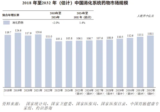 按销售收益计,中国消化系统药物的市场规模由2018年的人民币1,197亿元下降至2024年的人民币1,058亿元,主要由于实行带量采购后药品价格大幅下降,预计2032年将增至人民币1,181亿元,复合年增长率为1.4%。
