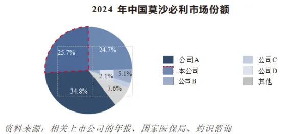 2021年,包括安必力®在内,共有三家公司的莫沙必利片被选入第四批国家VBP计划,其后,该三家公司成为莫沙必利市场的主要公司,并在市场规模上取得显着增长。于2024年,以销售收益计,该三家公司占中国莫沙必利总市场份额约85.2%。下图载列彼等各自的市场份额的排名: