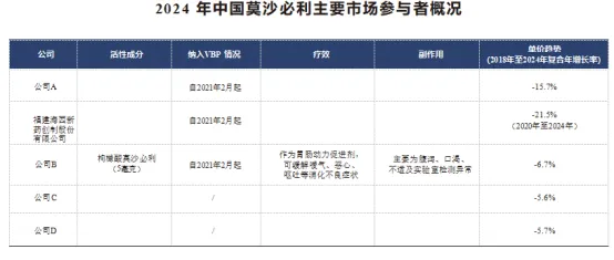莫沙必利于2021年被纳入VBP计划,大部分市场份额被中标企业瓜分。随着VBP计划持续实施,新的市场参与者将面对日益激烈的竞争,难以抢占市场份额。