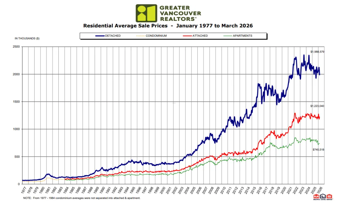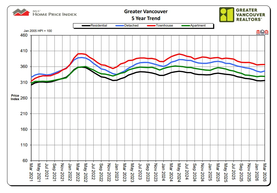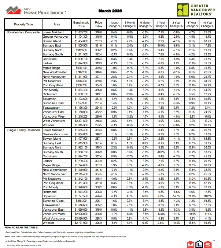 大温地区所有住宅物业的MLS®房价指数综合基准价目前为$1,104,300加元。与2025年3月相比下降了6.8%,但较2026年2月则小幅上升了0.4%。