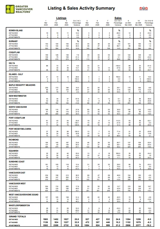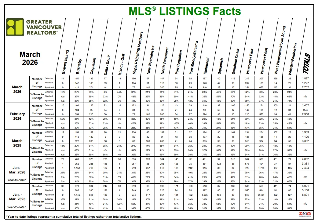 There were 5,792 detached, attached and apartment properties newly listed for sale on the Multiple Listing Service® (MLS®) in Metro Vancouver in March 2026. This represents a 10.3 percent decrease compared to the 6,455 properties listed in March 2025. This was 4.9 percent above the 10-year seasonal average (5,521).