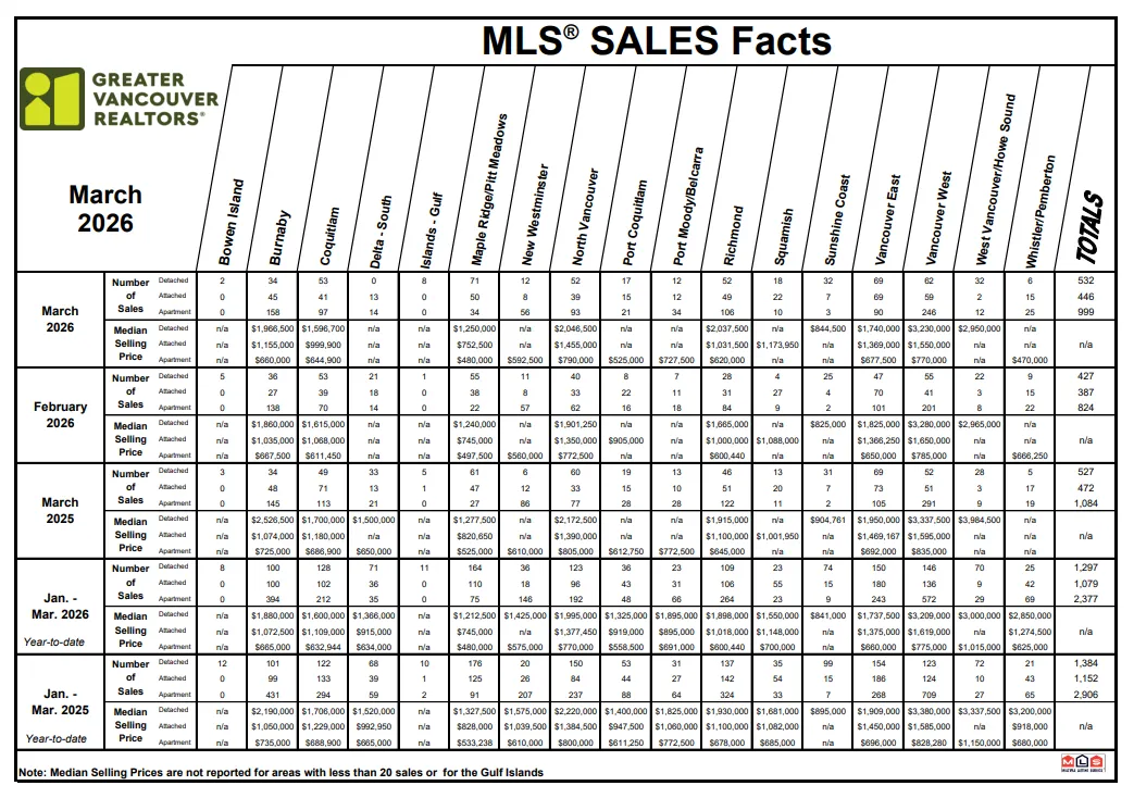 Sales of detached homes in March 2026 reached 571, an 8.3 percent increase from the 527 detached sales recorded in March 2025. The benchmark price for a detached home is $1,854,800. This represents an 8.2 percent decrease from March 2025 and a 1 percent increase compared to February 2026.
