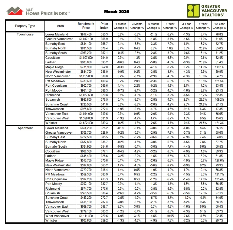 Attached home sales in March 2026 totalled 446, a 5.5 percent decrease compared to the 472 sales in March 2025. The benchmark price of a townhouse is $1,047,100. This represents a 5.7 percent decrease from March 2025 and a 0.1 percent increase compared to February 2026.