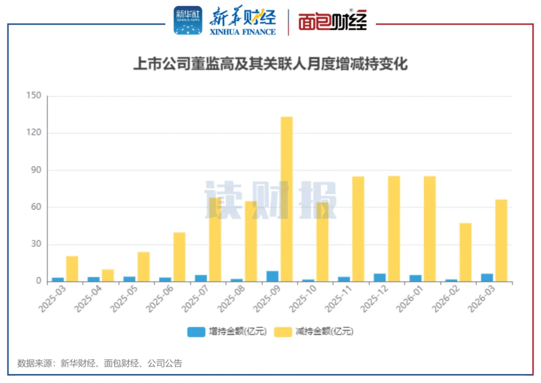 新华财经和面包财经研究员根据上市公司的信披数据统计,2026年3月,沪深两市上市公司董监高及其关联人减持金额合计约66.22亿元,涉及166家公司;增持金额合计约6.16亿元,涉及70家公司。增、减持金额相抵之后,净减持金额60.06亿元。