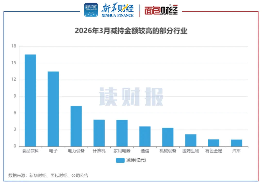 3月份,各行业中,食品饮料行业减持金额居首位,传媒行业增持金额最多。
