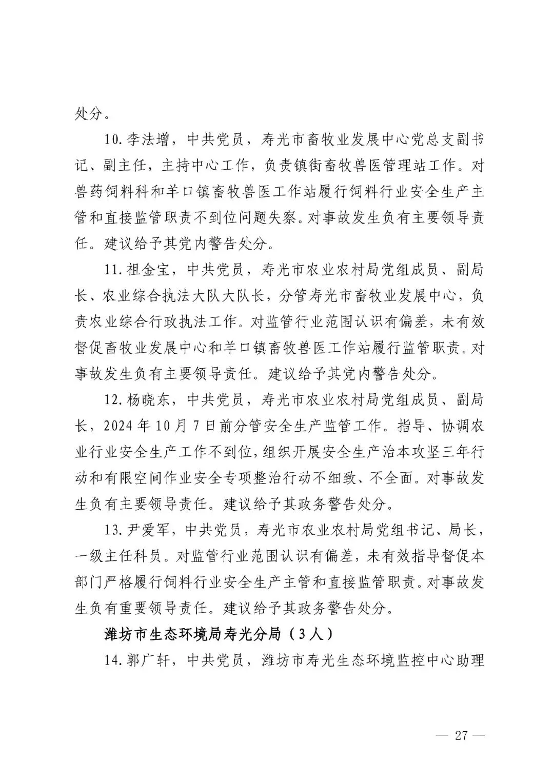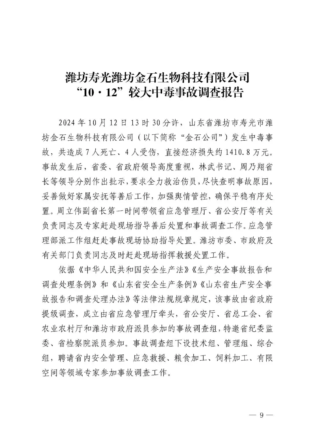 2024 年 10 月 12 日 13 时 30 分许,山东省潍坊市一公司发生中毒事故,共造成 7 人死亡、4 人受伤,直接经济损失约 1410.8 万元。