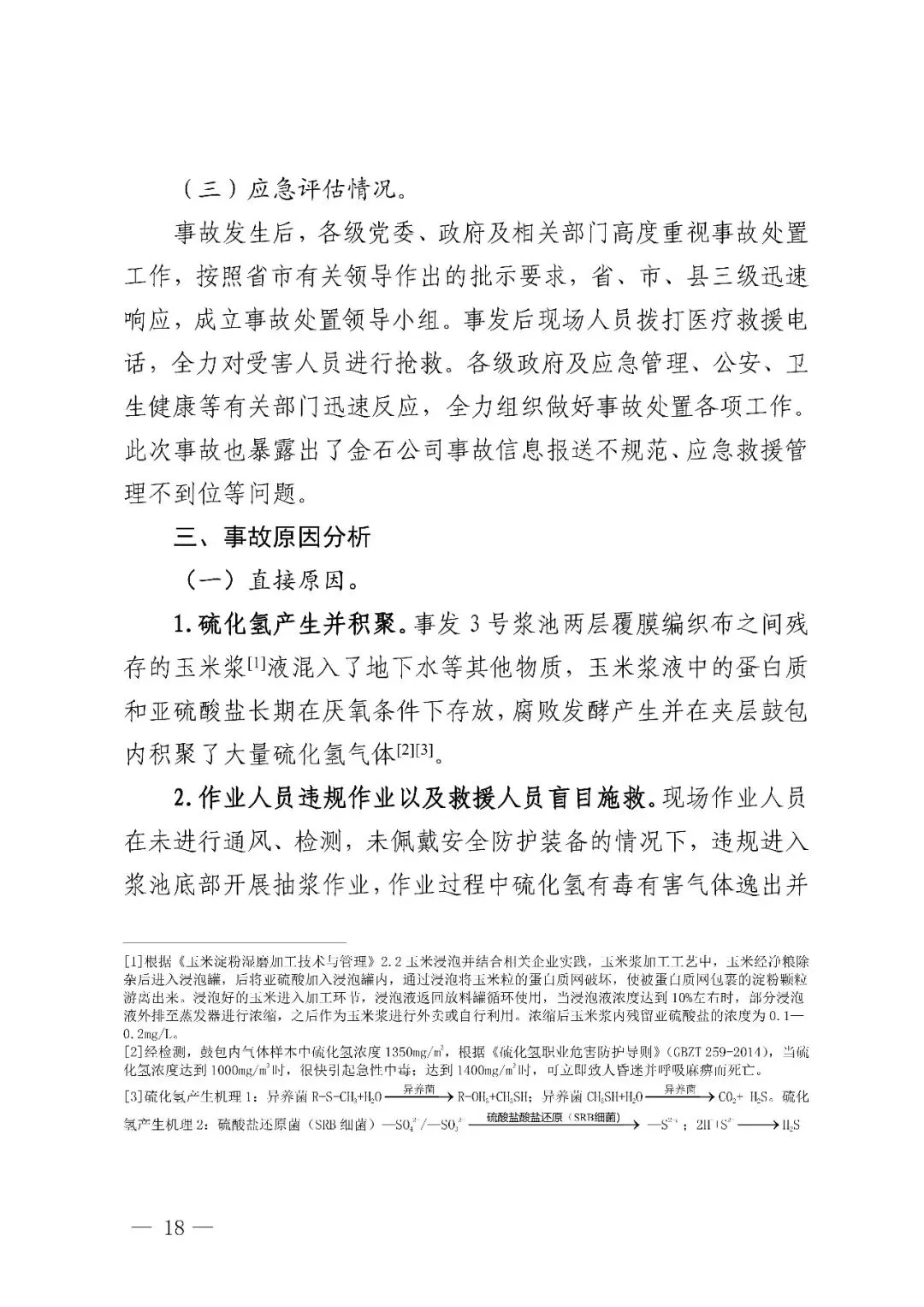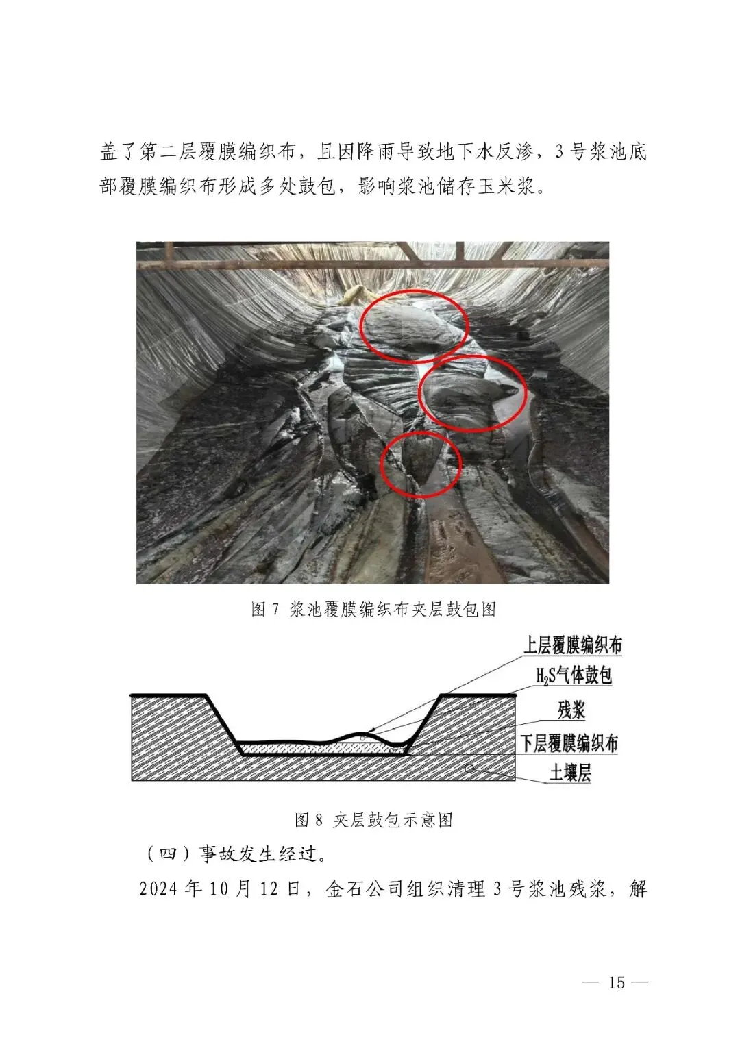 存的玉米浆液混入了地下水等其他物质,玉米浆液中的蛋白质和亚硫酸盐长期在厌氧条件下存放,腐败发酵产生并在夹层鼓包内积聚了大量硫化氢气体。