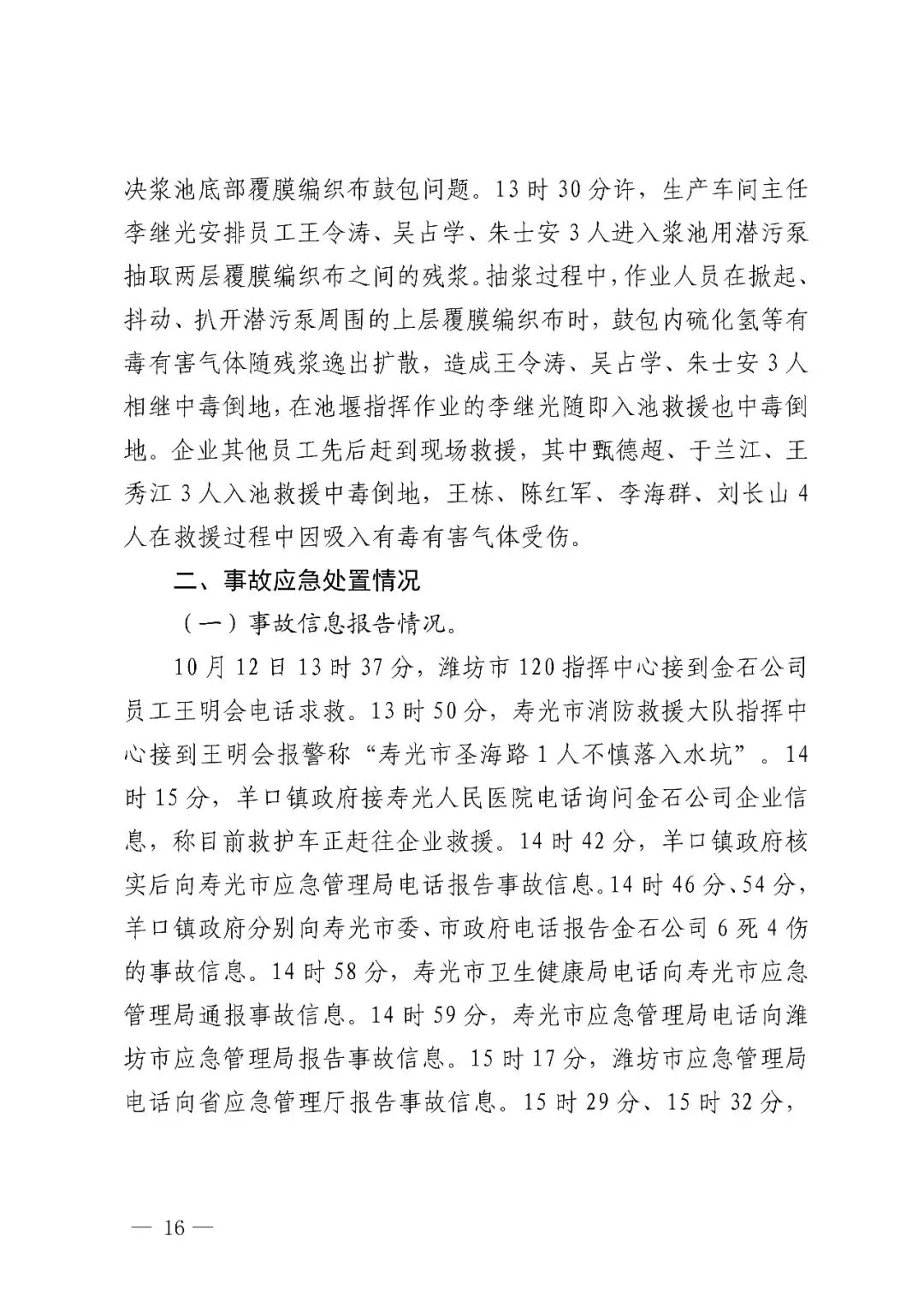 2024 年 10 月 12 日,金石公司组织清理 3 号浆池残浆,解决浆池底部覆膜编织布鼓包问题。13 时 30 分许,生产车间主任安排 3 名员工人进入浆池用潜污泵抽取两层覆膜编织布之间的残浆。抽浆过程中,作业人员在掀起、抖动、扒开潜污泵周围的上层覆膜编织布时,鼓包内硫化氢等有毒有害气体随残浆逸出扩散,造成 3 名作业人员相继中毒倒地,在池堰指挥作业的李继光随即入池救援也中毒倒地。企业其他员工先后赶到现场救援,其中 3 人入池救援中毒倒地, 4人在救援过程中因吸入有毒有害气体受伤。