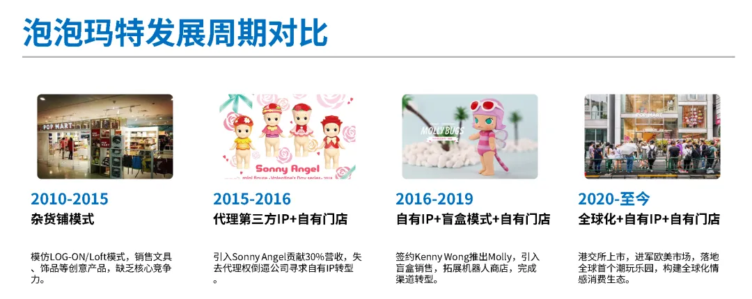 泡泡玛特的生意,先后经历几次转型,从杂货铺模式到缩减SKU,转变为杂货铺(自有门店)+第三方潮玩IP,再到做自有IP+自有门店+盲盒产品创新,再到上市后开始的全球化、多IP运营。