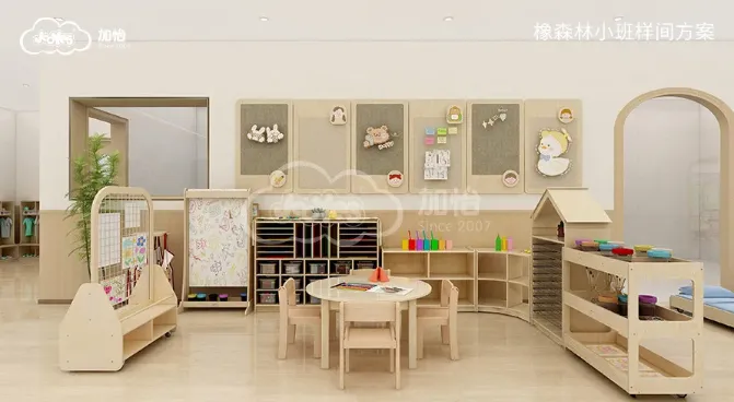 JOOYES加怡全新推出的“橡森林系列”实木产品线,甄选优质天然橡胶木,通过硬度与承重更优的实木板材结合精心配比的自然纹理,打造出全龄段适配的幼教空间方案。该系列以未加雕琢的原始木色、圆融连贯的造型与灵活组合的柜体设计,将自然舒适感融入空间细节。(JOOYES加怡公众号)