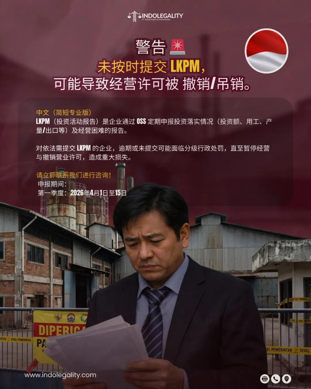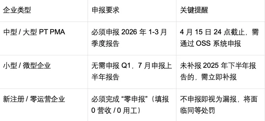 2026 年 Q1 LKPM 投资报告申报已进入关键冲刺期(4 月 1 日 - 4 月 15日),中型 / 大型外资企业(PT PMA)需在 15天内完成申报,逾期最高罚 1 亿印尼盾(约 3.8 万人民币),还可能被暂停 NIB 执照,导致资质审批、项目推进全面卡壳!