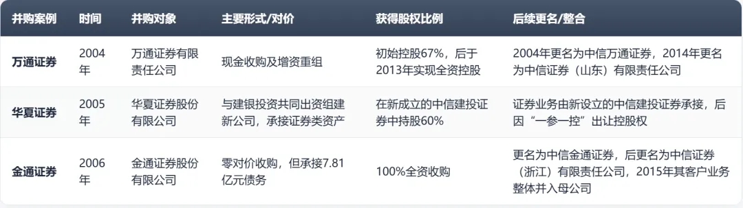在2004年至2006年的国内并购阶段,中信证券的战略动因主要集中于低成本的规模扩张与区域网络补强,其并购决策具有鲜明的“逆周期”特征和显著的性价比考量1,31。具体而言,收购万通证券、华夏证券与金通证券,均发生在证券市场持续低迷、券商行业风险集中暴露及监管层启动综合治理的宏观与行业背景下20。国务院于2004年发布《关于推进资本市场改革开放和稳定发展的若干意见》(国发〔2004〕3号),奠定了资本市场发展的政策基调18。随后,为化解行业系统性风险,证监会于2005年主导推动证券公司综合治理,明确鼓励“资质良好、具备持续发展能力的证券公司”通过收购兼并做优做强,支持其吸收高风险公司剥离的经纪业务、专业队伍和客户资源21,23。在此背景下,中信证券精准把握了政策窗口与市场底部机遇1。收购万通证券(后更名为中信证券(山东))的直接动因是切入山东市场,迅速扩大营业网络1。2003年,中信证券在山东地区仅有4家营业部,至2004年通过收购快速跃升至18家1。收购金通证券(后更名为中信证券(浙江))则以巩固长三角区域优势为目标,通过此次收购,中信证券实际拥有的营业网点超过200个,其“大网络战略”与“沿海战略”得以进一步推进1,24。对于华夏证券的重组,则是在北京市政府主导下,中信证券联手建银投资承接陷入危机的华夏证券的优质资产,以市场化方式化解金融风险,并由此获得了中信建投证券这一重要平台1,13。这一时期的并购,目标标的普遍面临经营危机,中信证券得以以较低成本吸纳其网点、客户与区域牌照资源,核心考量是“收益性价比”与“拓展业务链条、打开区域市场”1,31,本质上是对国内经济发达沿海地区经纪业务版图的战略性填补。