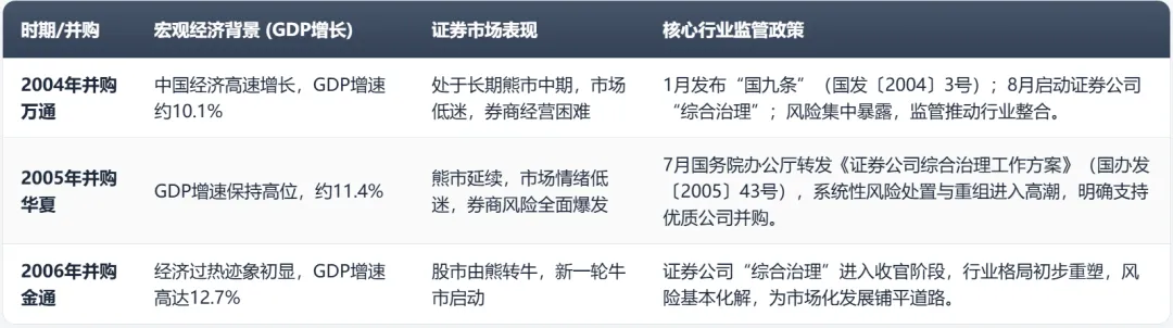 2.1.2 宏观经济、政策环境与并购动因 此次并购并非孤立的商业行为,而是深刻嵌入于当时特定的宏观经济与监管环境之中。从宏观经济层面看,2003年至2004年,中国GDP增速保持在10%左右的快速通道,经济持续向好,为资本市场改革提供了基础12。然而,与之形成鲜明对比的是,股票市场自2001年高点后持续低迷,上证综指在2004年大部分时间在1300点至1700点间震荡,证券行业经营环境严峻,普遍面临亏损12。 更为关键的是政策环境的变化。2004年,中国资本市场发展迎来纲领性文件。2004年1月31日,国务院发布《关于推进资本市场改革开放和稳定发展的若干意见》(国发〔2004〕3号,俗称“国九条”),明确提出“大力发展资本市场是一项重要的战略任务”,并指出了完善资本市场体系、拓宽证券公司融资渠道等方向18。为贯彻落实该文件,国务院于2004年7月批准成立了六个专题工作小组,其中就包括“拓宽证券公司融资渠道专题工作小组”,为券商通过市场化方式发展提供了初步的政策依据。 然而,监管的另一面是对行业积弊的彻底清算。2003年底至2004年上半年,证券行业多年累积的风险呈现集中爆发状态20。在此背景下,2004年8月,证监会召开专题会议,全面部署和启动了针对全行业的“综合治理”工作20。此次综合治理旨在化解历史风险,建立新的机制,其核心手段之一便是关闭或重组一批高风险券商,并鼓励优质公司进行收购兼并21。正是在这种“行业风险集中释放”与“监管推动整合”的双重背景下12,中信证券收购万通证券的行动具备了典型的“逆周期”特征:在行业整体陷入困境、市场估值偏低时出手,以相对较低的成本获取了宝贵的区域市场准入资格和营业网点资源。这标志着中信证券开始将“逆周期收购”作为一种核心成长策略,并在此后的多次并购中反复运用1。