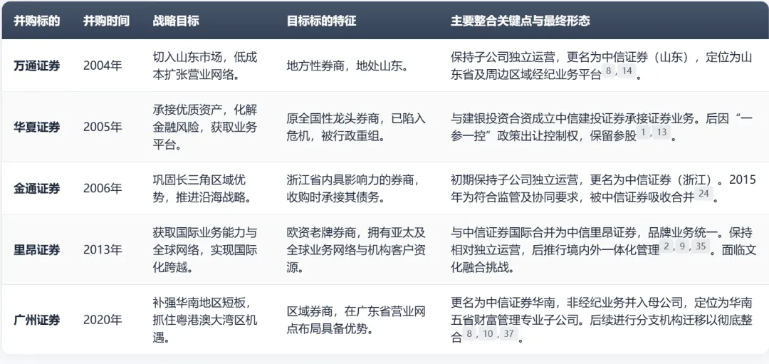 综上所述,中信证券的并购史是一条沿着“国内区域深耕 -> 全球资源布局”路径清晰演进的战略扩张之路15。其核心逻辑在于,精准利用行业周期与政策驱动的整合窗口,以性价比高的方式获取关键区域市场或业务能力,并通过审慎而灵活的整合实现协同效应,最终驱动公司综合竞争力与行业地位的持续跃升。