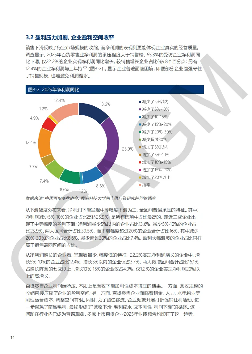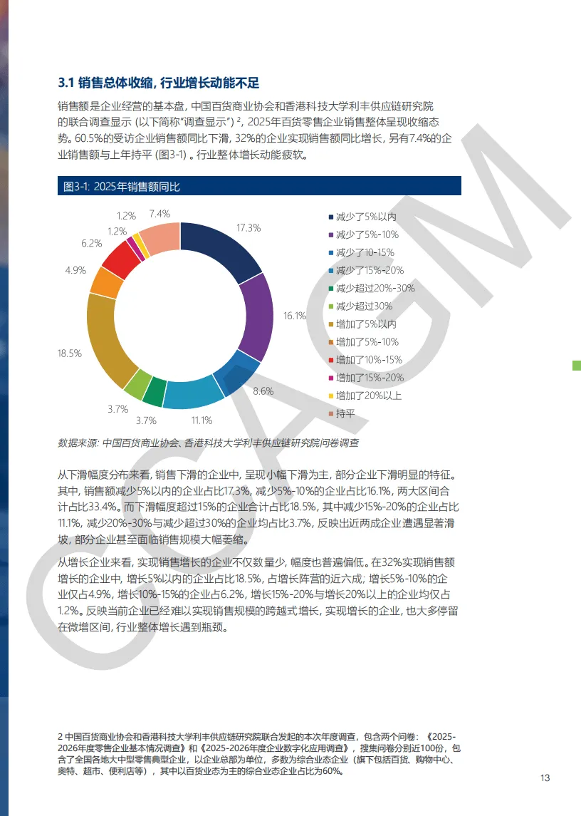 《2025-2026 年中国百货零售业发展报告》梳理了行业发展现状、机遇与挑战,研判了未来趋势并提出发展建议,指出百货零售业正处于存量调改与结构升级的深度转型期。2025 年中国宏观经济平稳增长,社会消费品零售总额突破 50 万亿元,但百货零售业却陷入销售收缩、盈利承压、客流与客单双降的困境,60.5% 受访企业销售额下滑,65.3% 企业净利润下降,超半数企业面临客流和客单价下滑问题,可选消费受冲击、线上分流等是主要原因,不过部分企业通过业态创新、高端化布局实现逆势发展。