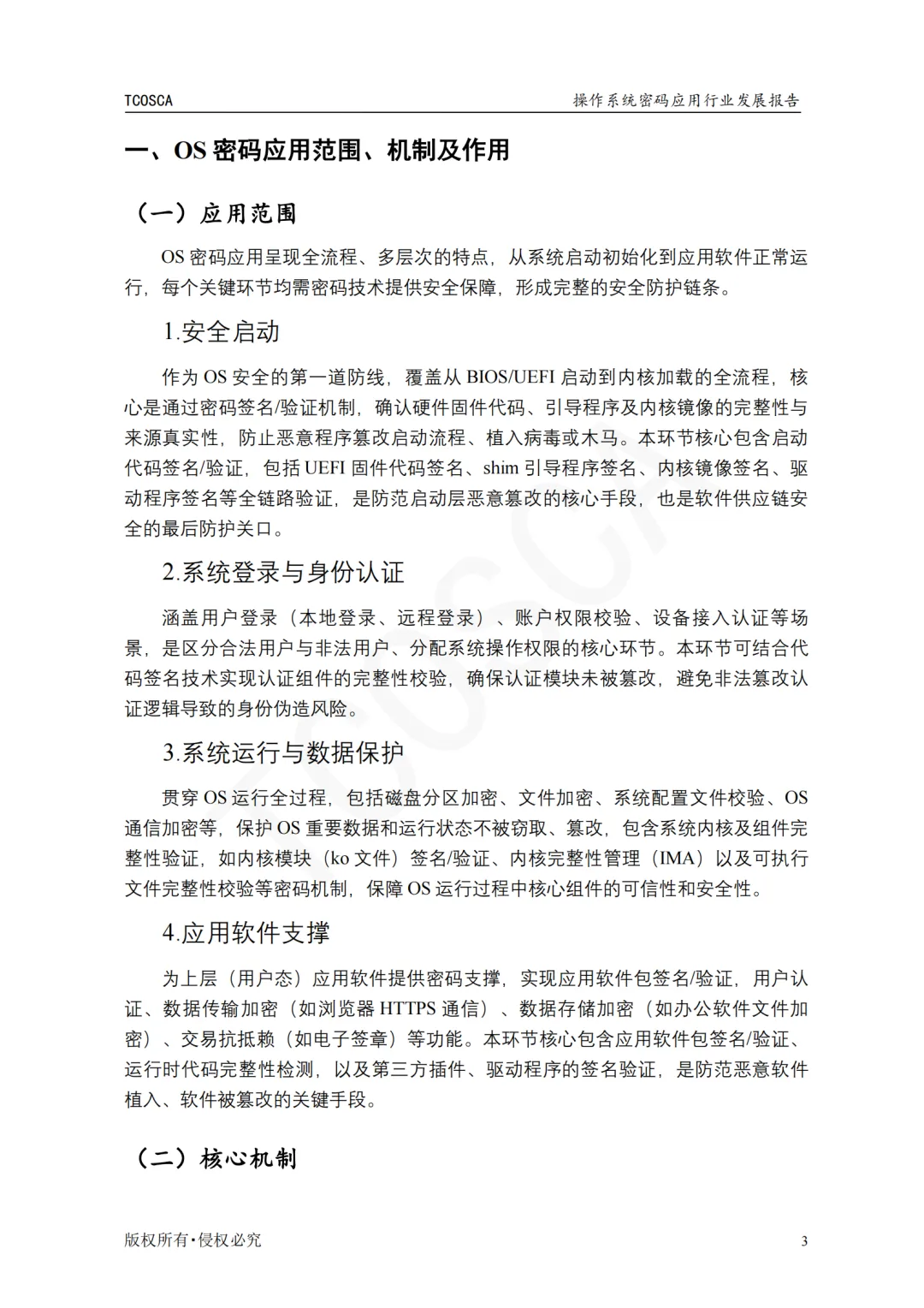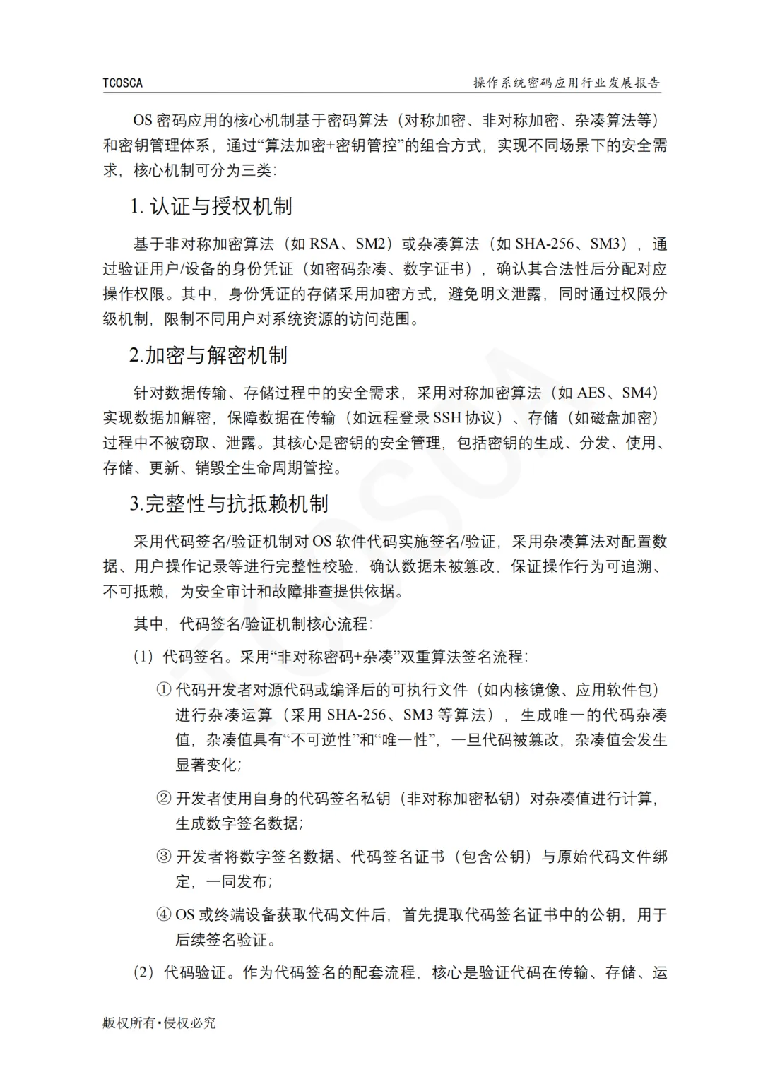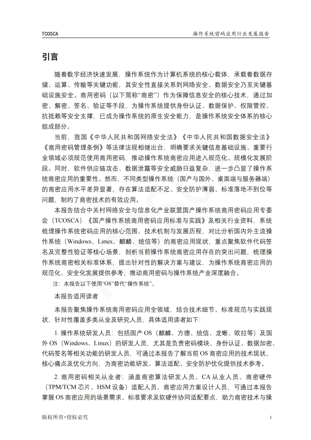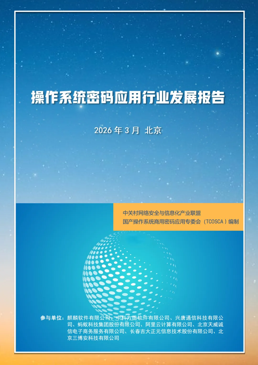 2026 年 3 月,中关村网络安全与信息化产业联盟及国产操作系统商用密码应用专委会(TCOSCA)发布《2026 操作系统密码应用行业发展报告》,全面梳理操作系统商用密码应用全景,剖析国内外系统差异、行业痛点并给出落地路径。