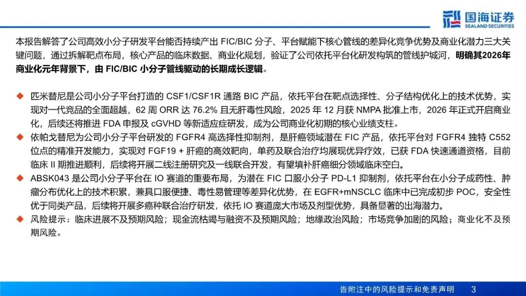 匹米替尼是公司小分子平台打造的CSF1/CSF1R通路BIC产品,依托平台在靶点选择性、分子结构优化上的技术优势,实实现对一代竞品的全面超越,62周ORR达76.2%且无肝毒性风险,2025年12月获NMPA批准上市,2026年正式开启商业化,后续还将推进FDA申报及cGVHD等新适应症研发,成为:公司商业化初期的核心业绩支柱。
