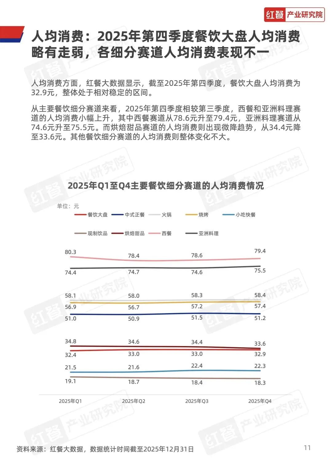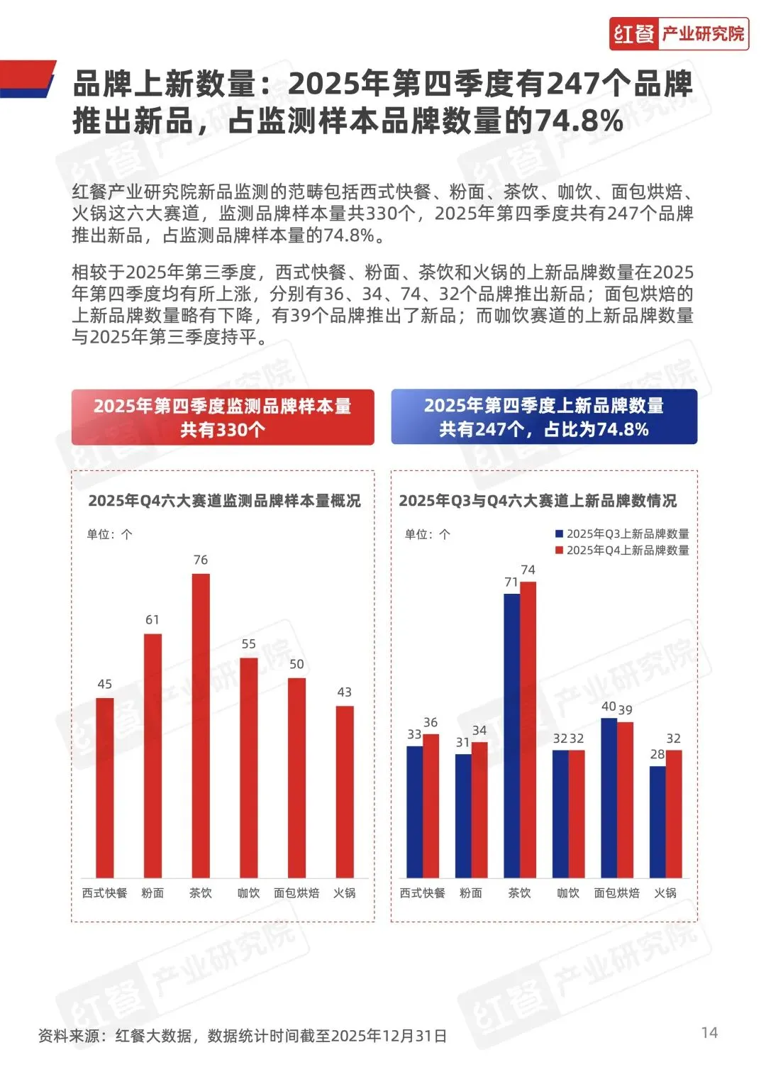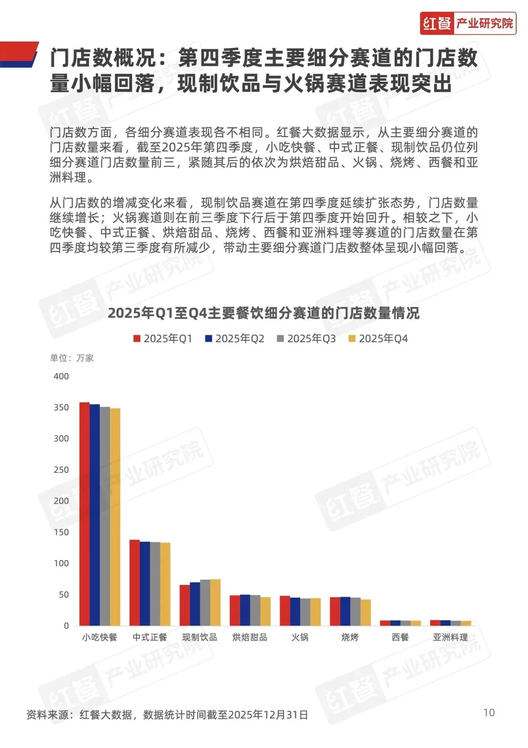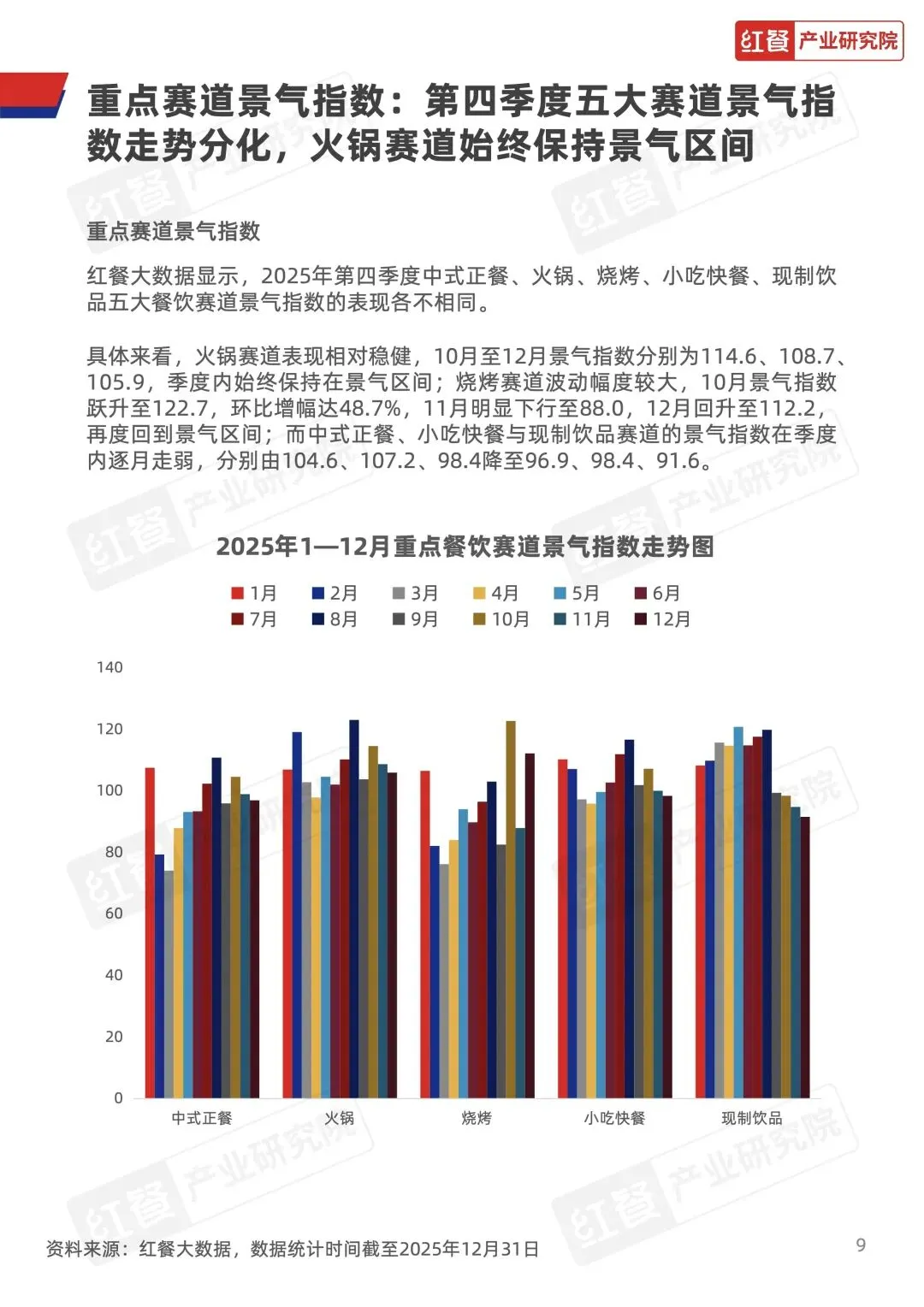 火锅赛道 Q4 景气指数始终位于荣枯线以上,表现最稳;烧烤 10 月冲高、11 月回落、12 月反弹;中式正餐、小吃快餐、现制饮品逐月走弱。门店数方面,现制饮品扩张、火锅回升,其余赛道小幅收缩,人均消费平稳,西餐、亚洲料理微升。 - 六大赛道密集上新,风味、配料、底汤成创新核心