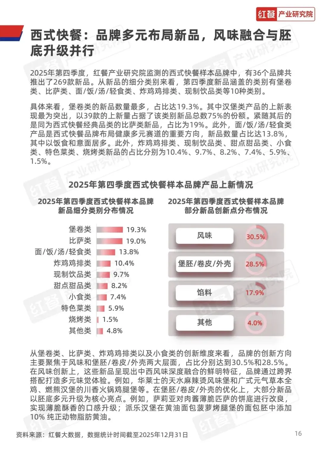 2025 年 Q4 全国餐饮收入16994 亿元,同比增长但逐月放缓,整体韧性较强。行业从增量扩张转向存量运营,企业注册量回落、存量超 1613 万家。新品聚焦风味融合、食材升级、季节与节日元素,新锐品牌靠颜值、场景、差异化突围,供应链向高价值食材与锁鲜技术升级。
