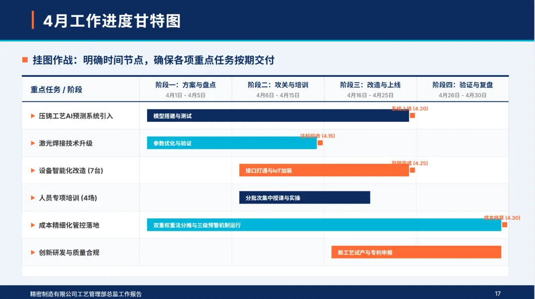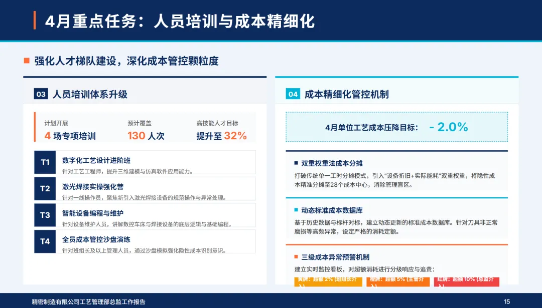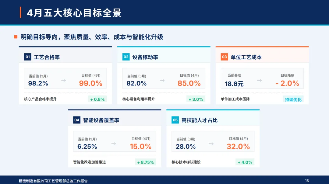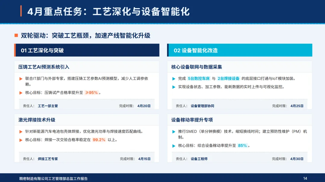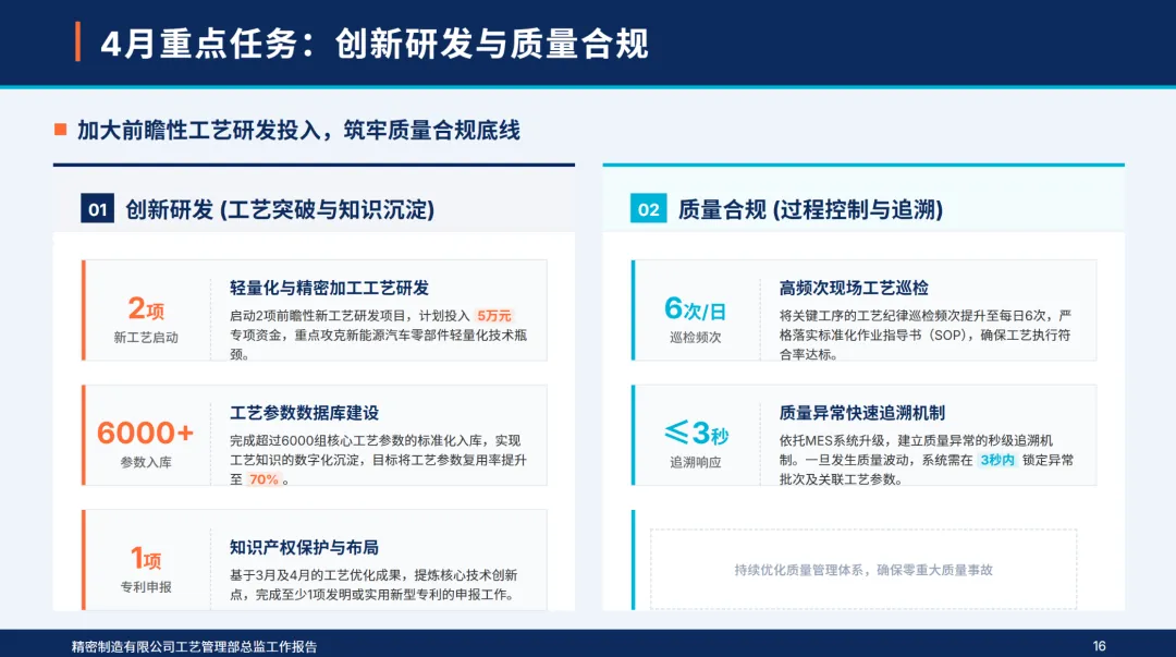 4月,部门制定了“工艺精确化,设备智能化,人员专业化,成本精细化,创新常态化”的5项工作目标,确定了核心产品的工艺合格率达到99%以上,设备利用率达到85%以上,单位工艺成本降低2%,智能设备覆盖率达到15%以上,高技术人才比例达到32%以上的核心指标。本月,公司完成了电池包支撑件压铸工艺的落地,高端电机外壳的激光焊接工艺的优化,7个关键设备的智能化改造,4个技术专项培训,作业成本法的深入控制,2个新工艺的开发和工艺参数的完善,同时,加强了质量巡检和合规管理,成立了追赶标杆团队,从组织、资源、监管、数据等四个维度上保证了各项工作的落实,不断缩小与行业标准的差距,夯实了技术根基,实现了高质量的发展。