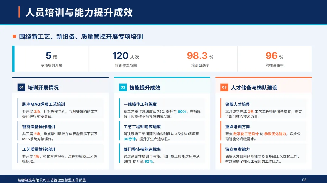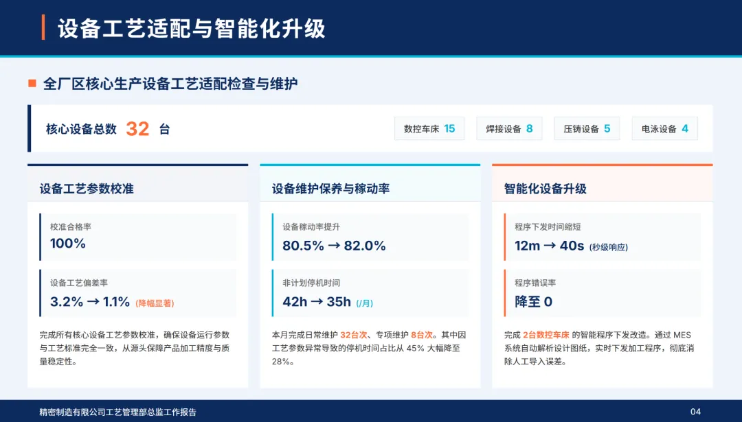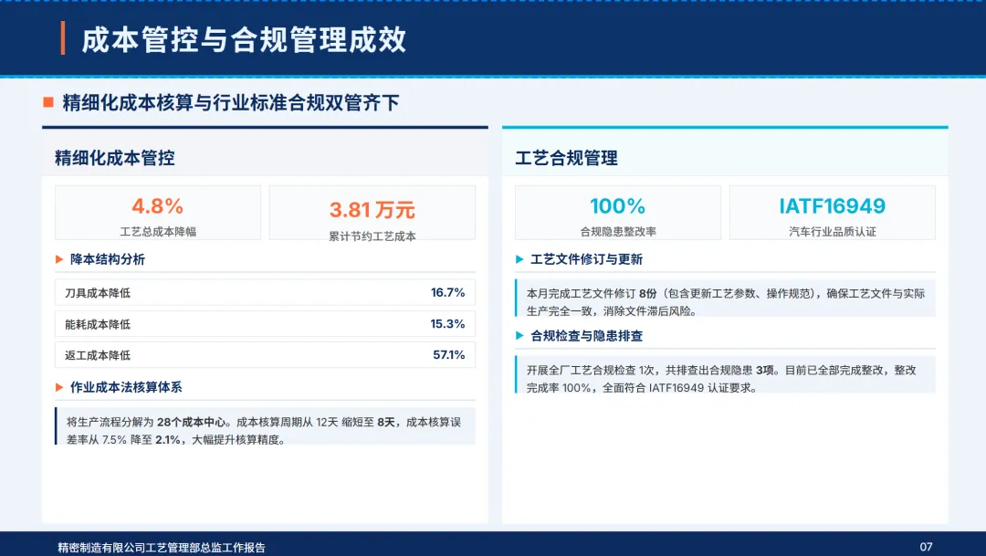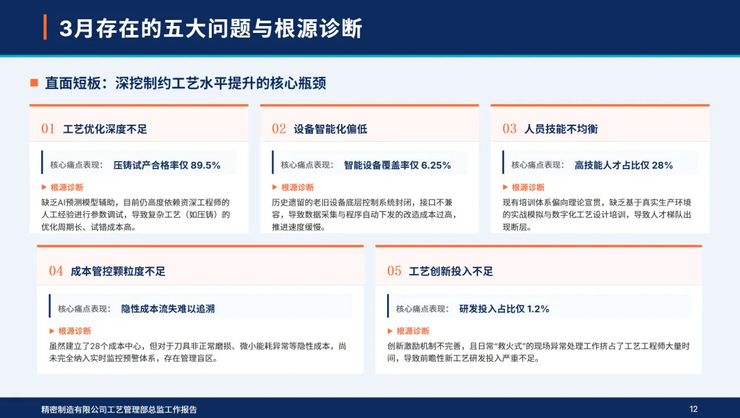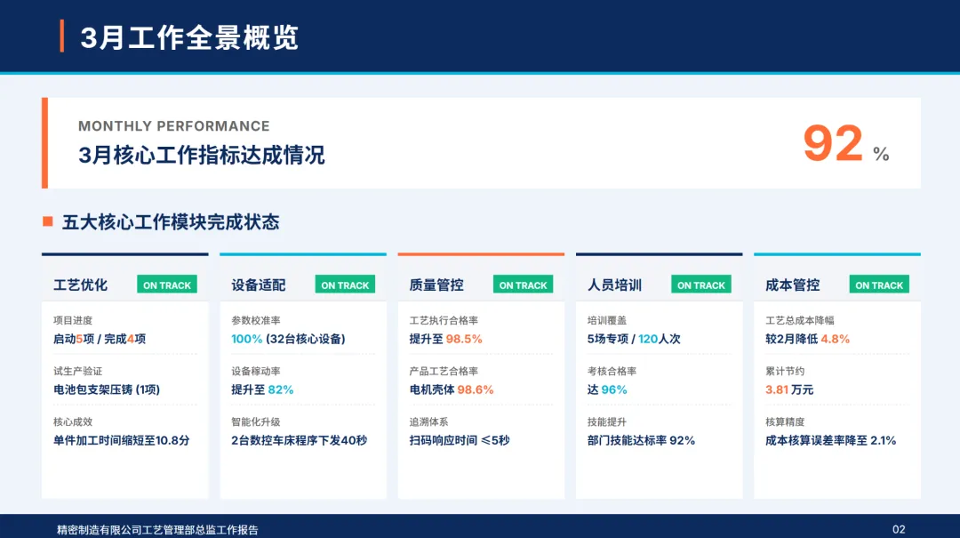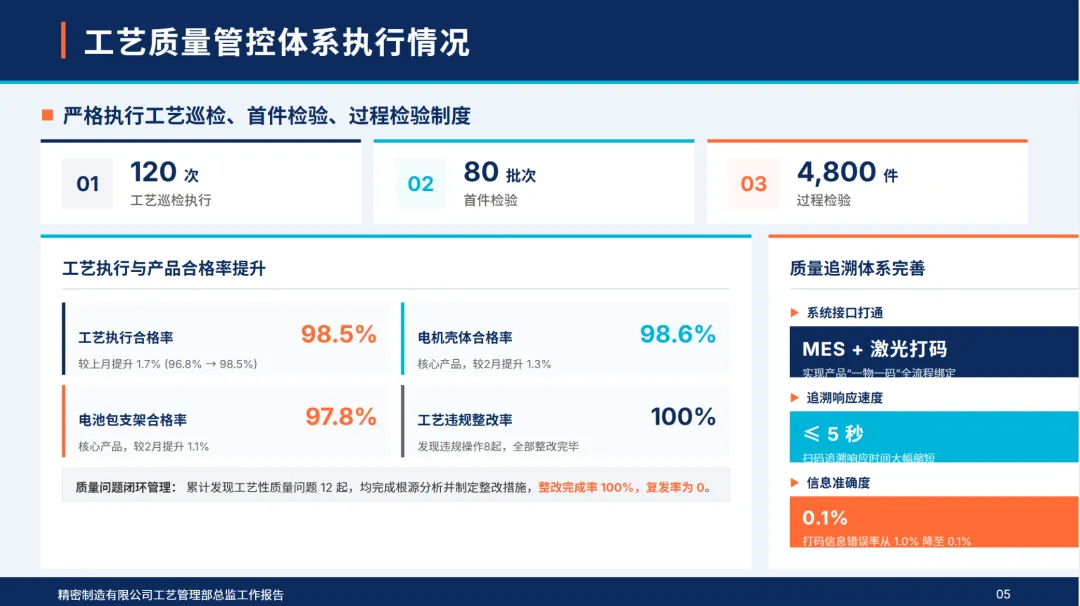 4月,部门制定了“工艺精确化,设备智能化,人员专业化,成本精细化,创新常态化”的5项工作目标,确定了核心产品的工艺合格率达到99%以上,设备利用率达到85%以上,单位工艺成本降低2%,智能设备覆盖率达到15%以上,高技术人才比例达到32%以上的核心指标。本月,公司完成了电池包支撑件压铸工艺的落地,高端电机外壳的激光焊接工艺的优化,7个关键设备的智能化改造,4个技术专项培训,作业成本法的深入控制,2个新工艺的开发和工艺参数的完善,同时,加强了质量巡检和合规管理,成立了追赶标杆团队,从组织、资源、监管、数据等四个维度上保证了各项工作的落实,不断缩小与行业标准的差距,夯实了技术根基,实现了高质量的发展。