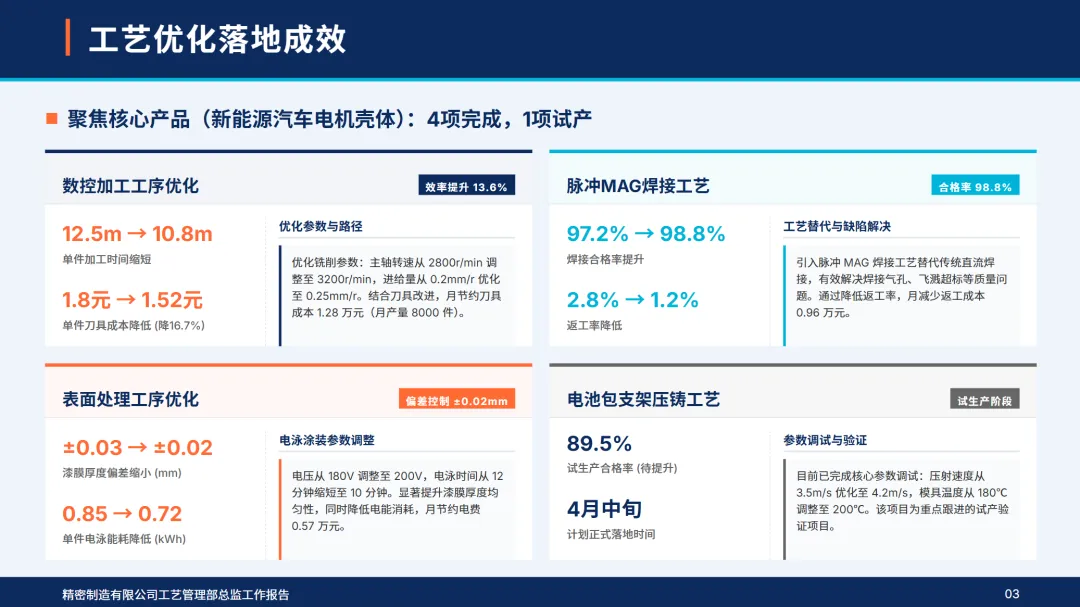 3月,部门以新能源汽车电机外壳、电池组件支架等核心产品为重点,对关键工序的数控加工,焊接和表面处理的优化取得显著成效,大幅降低了单件加工时间,降低了刀具成本,降低了能耗,提高了产品合格率。整个厂房的核心制造设备都达到了工艺匹配和维修,两个 CNC机床都达到了智能编程,提高了生产效率和设备的稳定性。工艺巡检、品检等全过程落实到位;质量跟踪系统开通后,响应速度和精度大幅提高;全员专项培训,一线员工和工程师的技术水平同步提升;成本核算和合规管理符合行业规范要求。