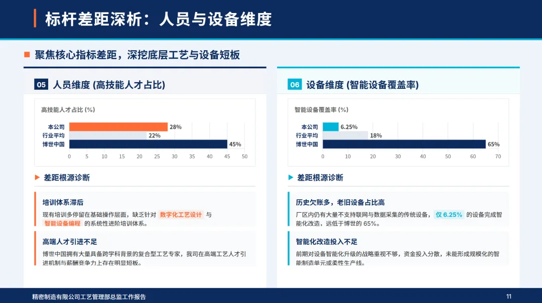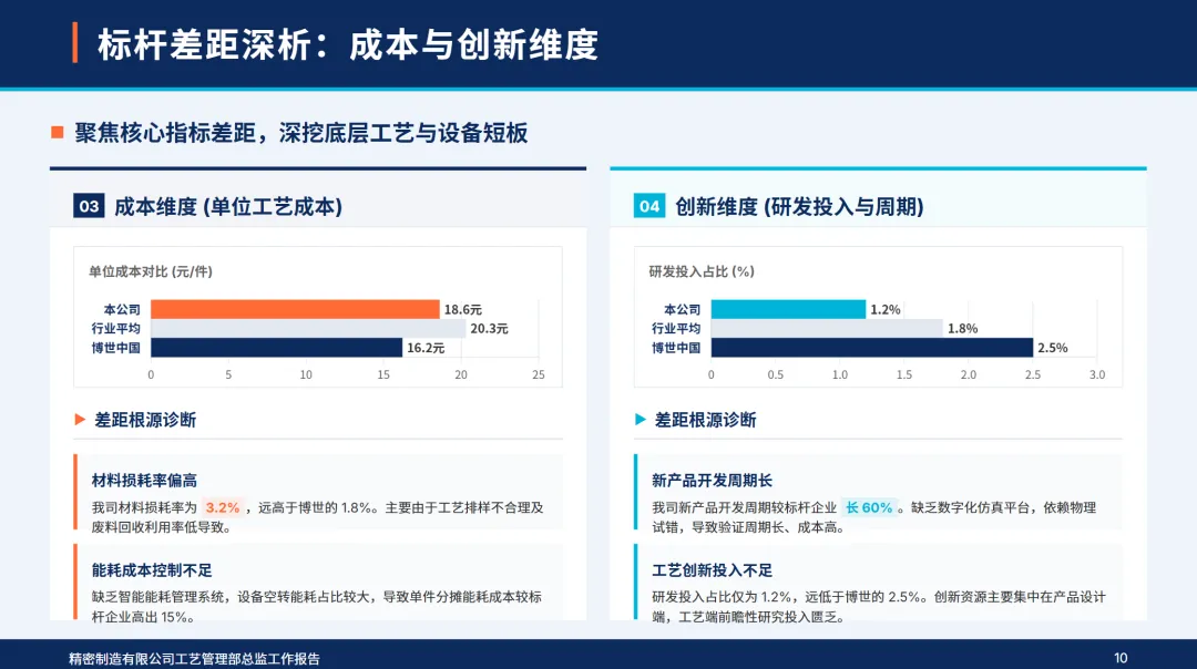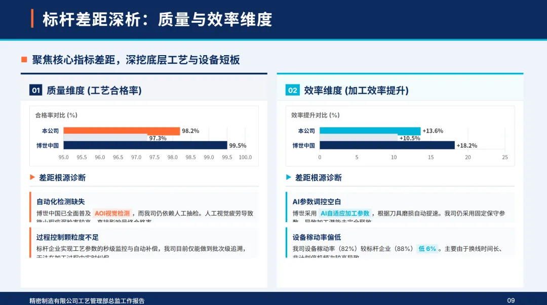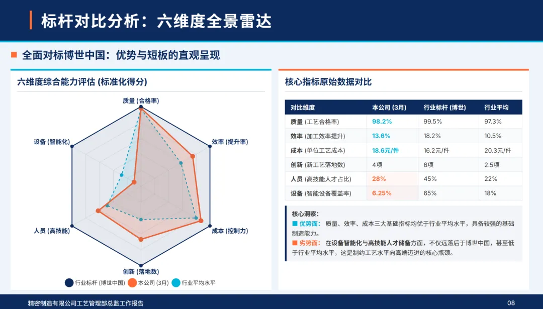 通过对博世中国和行业平均水平的多维比较,物流部门的质量,效率,成本等指标均优于行业平均水平,但高端流程精度,设备智能化程度,高技术人才比例,创新投入等指标与行业标准的差距较大,反映出物流部门流程优化深度不够,智能设备覆盖程度较低,成本控制粗放,创新研发滞后等方面的不足。