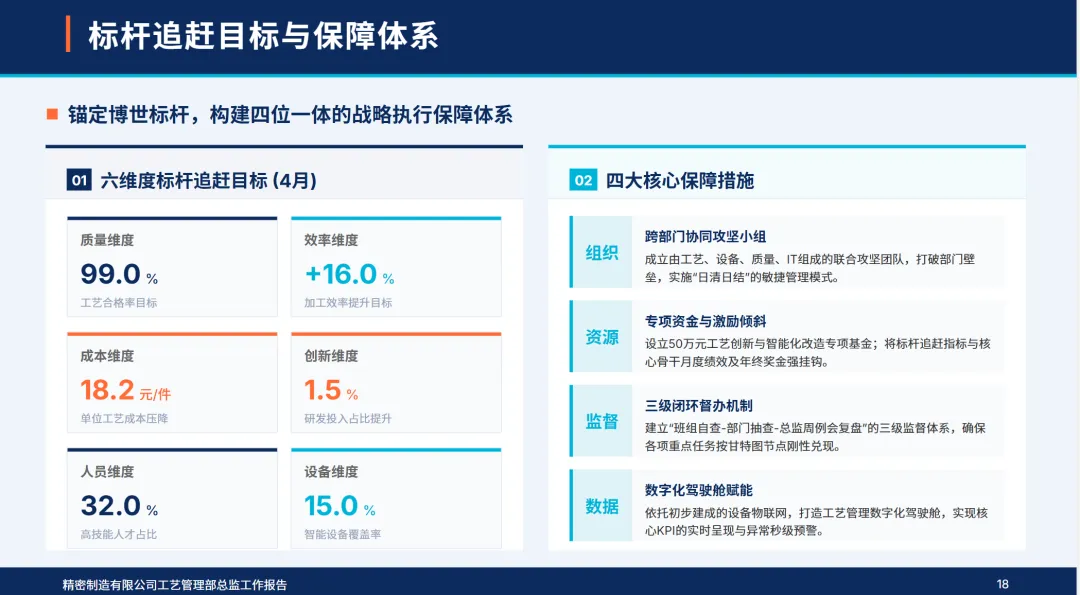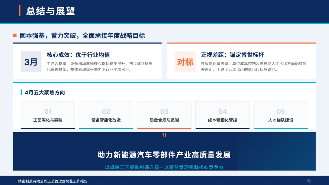 精密制造工艺管理部3月紧扣公司数字化工艺、精益生产、质量领先年度目标,完成工艺优化、设备适配、质量管控等五大核心工作,核心指标达成率92%,同时对标博世中国排查差距;4月以问题为导向制定追赶计划,全力缩小与行业标杆的距离,支撑公司新能源汽车零部件生产提质增效。