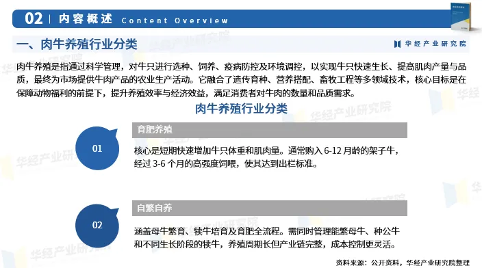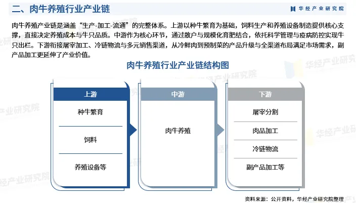肉牛养殖产业链是涵盖“生产-加工-流通”的完整体系。上游以种牛繁育为基础,饲料生产和养殖设备制造提供核心支撑,直接决定养殖成本与牛只品质。中游作为核心环节,通过散户与规模化育肥结合,依托科学管理与疫病防控实现牛只出栏。下游衔接屠宰加工、冷链物流与多元销售渠道,从冷鲜肉到预制菜的产品升级与全渠道布局满足市场需求,副产品加工更延伸了产业价值。