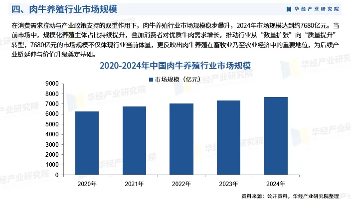在消费需求拉动与产业政策支持的双重作用下,肉牛养殖行业市场规模稳步攀升,2024年市场规模达到约7680亿元。当前市场中,规模化养殖主体占比持续提升,叠加消费者对优质牛肉需求增长,推动行业从“数量扩张”向“质量提升”转型,7680亿元的市场规模不仅体现行业当前体量,更反映出肉牛养殖在畜牧业乃至农业经济中的重要地位,为后续产业链延伸与价值升级奠定基础。
