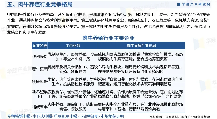 中国肉牛养殖行业竞争格局正从分散走向集中,呈现清晰的梯队特征。第一梯队为伊利、蒙牛、新希望等全产业链龙头企业,通过并购整合与技术创新占据主导。第二梯队是区域领军企业,如福成五丰、双汇发展等,依托地方资源形成产业集群,在细分区域市场具备较强竞争力。第三梯队为中小型养殖户及合作社,占比仍较高但面临淘汰压力,多通过与龙头合作实现生存发展。