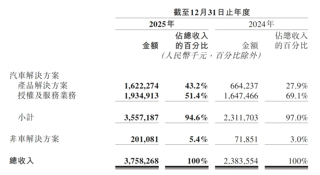 从业务结构来看,地平线的营收主要依靠汽车业务。2025年,汽车业务收入为35.57亿元,占总营收的94.6%,同比增长53.9%。