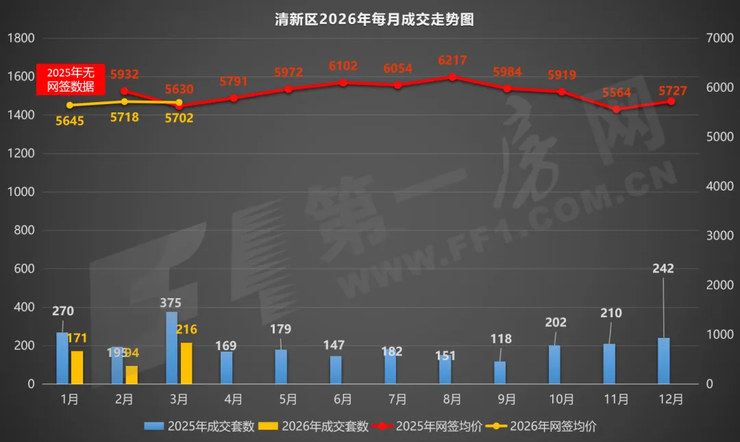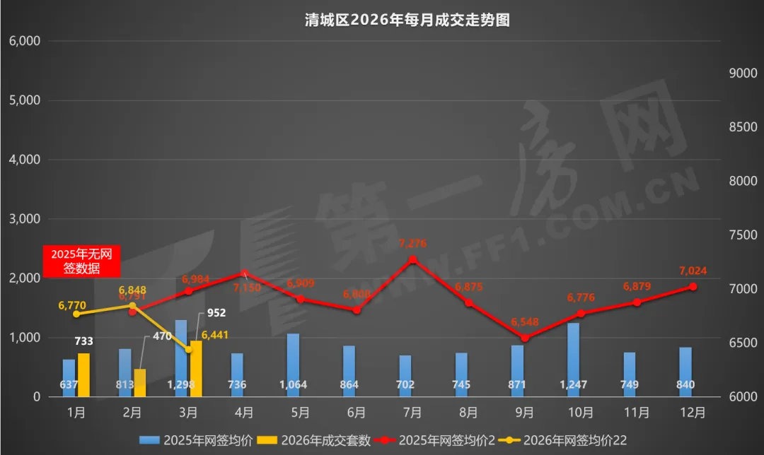 一手市场方面, 清城与清新两区网签套数分别环比暴涨 103% 与 130%,成交规模迅速扩大。与此同时,网签均价分别环比下降 6% 与 0.3%,表明开发商为促成交,以适度让利为主要去化手段,整体呈现“量升价稳”的健康发展态势。二手市场同样保持强劲增长,清城与清新的网签套数分别环比上涨 77% 与 65%,反映出刚需及改善型客群的入场意愿较强,二手房流通性显著改善。进入4月,随着传统淡季到来及3月高基数效应,市场热度预计将出现阶段性回落。*备注:数据来源于清远市商品房管理信息平台,由第一房网统计,仅供参考。