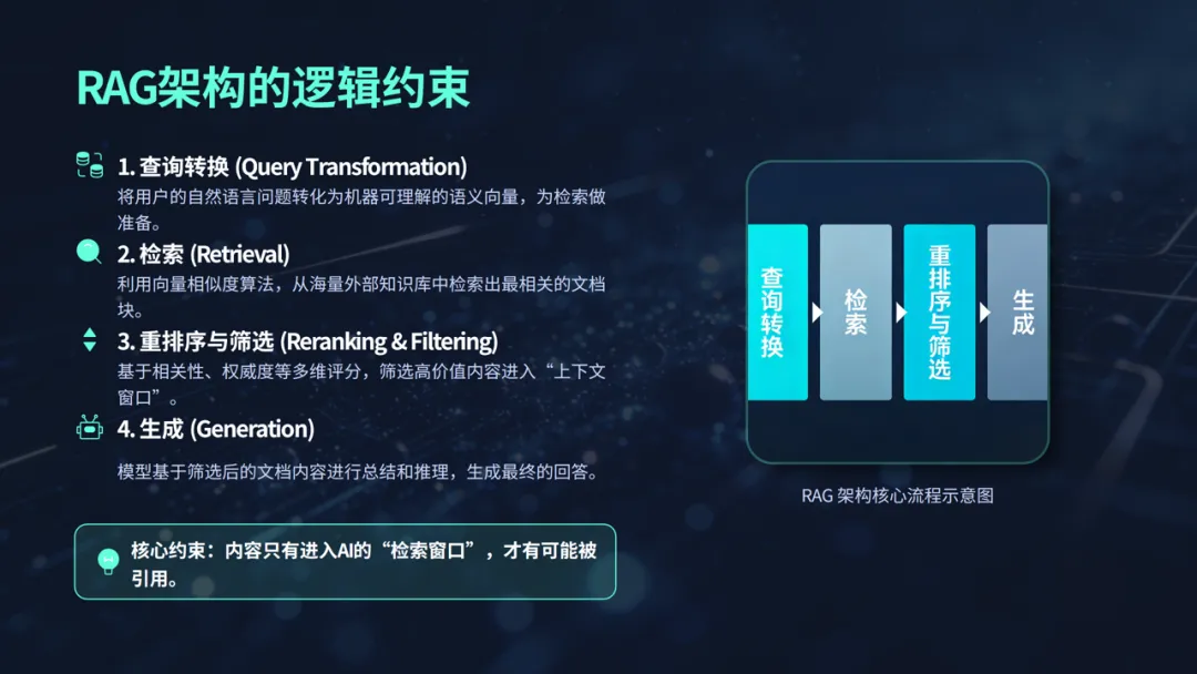 由于训练基础模型的成本极其昂贵且存在知识滞后性,AI 平台普遍采用了检索增强生成(RAG)架构。这一架构决定了信息被“选中”的物理边界。