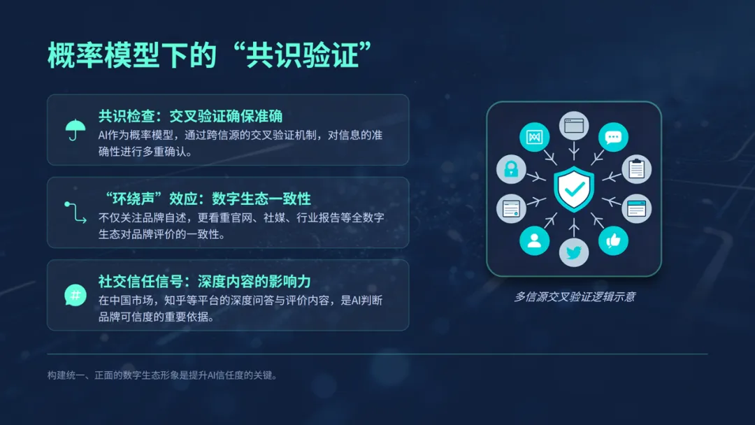 LLM 在本质上是概率模型。为了确保准确性,AI 系统会进行跨信源的共识检查。在国外,如果一个品牌在官网上的自述、维基百科的定义、第三方专业论坛的讨论以及行业白皮书中的数据保持高度一致,AI 就会给该品牌分配更高的信任权重。中国 AI 模型高度依赖社交信任信号。研究显示,在知识密集型行业,经由知乎优化的品牌,其AI 引用率可提升至65% 以上。AI 通过交叉验证品牌在官网、行业垂直媒体及社交平台的一致性来决定“谁更值得信任”。这种“环绕声”效应(Surround Sound PR)是2026 年GEO 的核心逻辑之一:AI 不仅仅听你说了什么,它更看整个数字生态对你的评价是否达成共识。