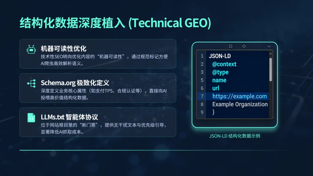 重构阶段 | 官网站点结构化重塑、llms.txt 部署、内容硬化 | 结构化知识库、JSON-LD 标记集群、llms.txt 配置文件 |